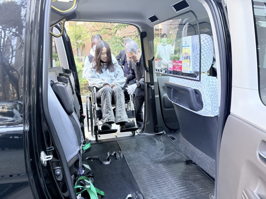 後半には“青空教室”として、校舎前に停められた3台の福祉車両の前に移動。助手席が電動で回転して乗り降りできる車両を体験したり、車椅子の乗り降りが横や後ろで異なるそれぞれのタイプの特徴などを、実際にタクシーを運転している乗務員から説明を受けました。